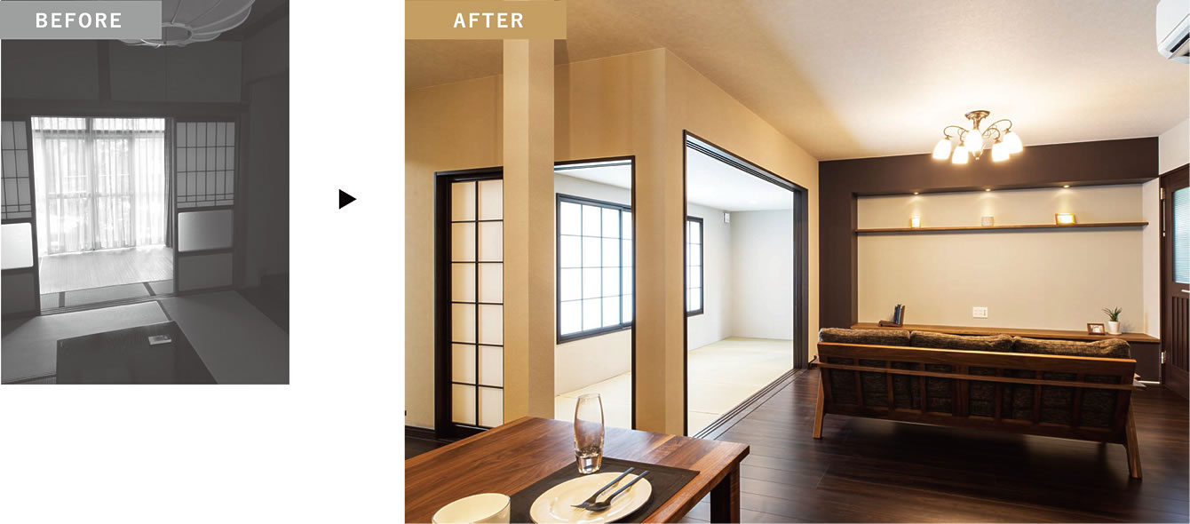 台所に隣接した東向きの和室でした。東側には隣家があり、敷地内にも人が通れる程度の余白しかなく薄暗い居間という印象でした。フルリフォーム後は、広縁を通して柔らかな陽射しが差し込む広々とした空間になりました。