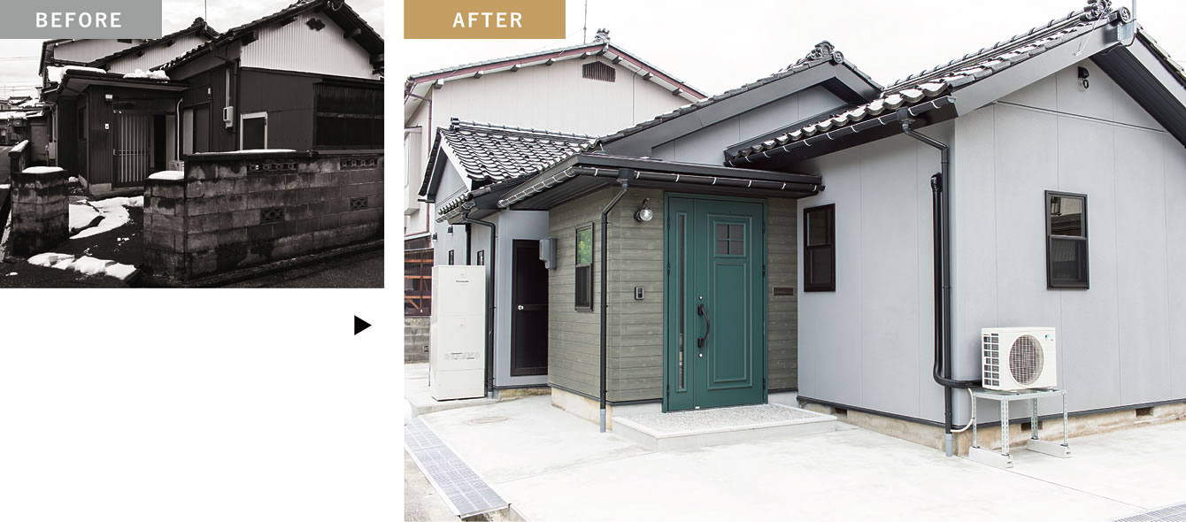 リフォーム前は板金とモルタル仕上げ。傷んだ部分をその都度修繕していった結果、塗装も微妙に色があわず継ぎ接ぎの様になっていました。新しいサッシを入れ、外壁はサイディング張りにし、グリーンのドアをアクセントにしたシンプルな外観に一新しました。