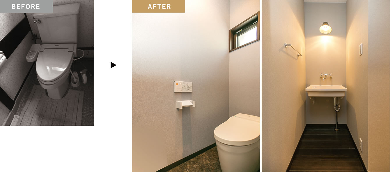 既存トイレスペースは床がタイル貼りで寒いイメージでした。今回のリフォームではスッキリとお洒落なタンクレストイレを採用、ゆったりと手洗いできるスペースは、家のイメージに合わせノスタルジックな雰囲気を漂わせたイメージにしました。